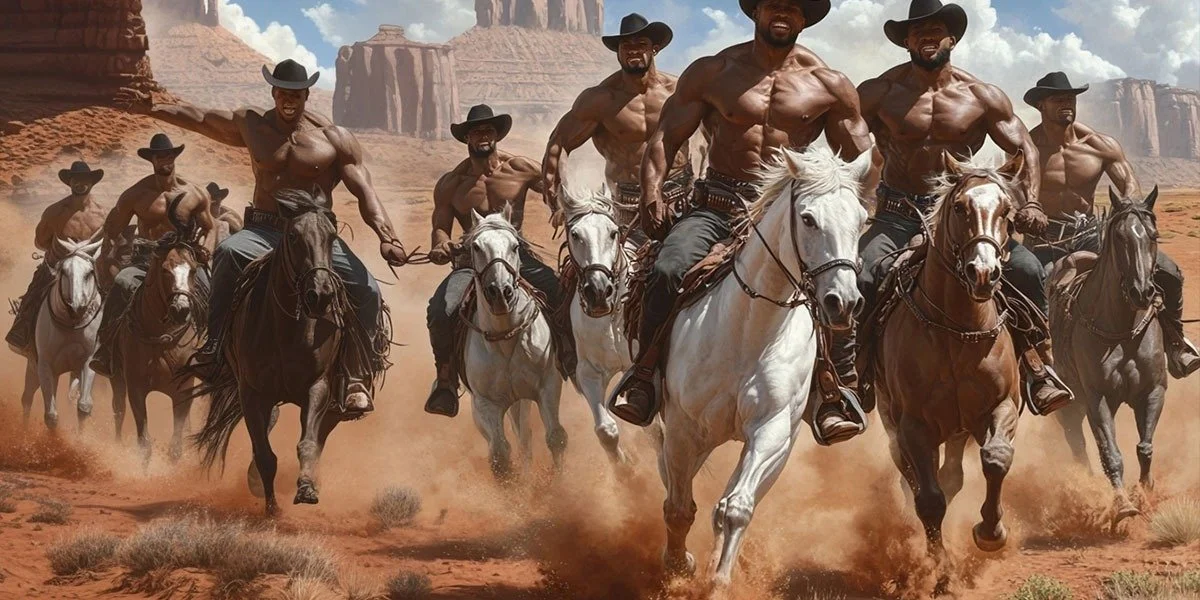 The cowboy embodied diversity, emerging from the young Mexican vaquero (not white European), whose Spanish-trained equestrianism was indebted to the culture of African Moors. Our lens is not one of patriarchy but emancipation, recalling that up to 25% of cowboys were black - and many were Mexican or Native American - and women, acting and dressing as they please; Calamity Jane generally wore men’s clothes.
